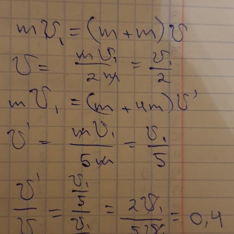 Горизонтально летящий снаряд массой M, застревая в подвешенном на нити свинцовом шарике такой же массы, сообщает ему скорость v. Определи, какую скорость v′ сообщит тот же снаряд при тех же условиях свинцовому шарику массой 5M. В ответе укажи отношение v′v.