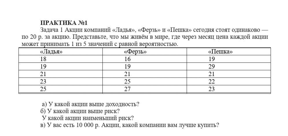 Акции компаний «Ладья», «Ферзь» и «Пешка» сегодня стоят одинаково — по 20 р. за акцию. Представьте, что мы живём в мире, где через месяц цена каждой акции может принимать 1 из 5 значений с равной вероятностью.