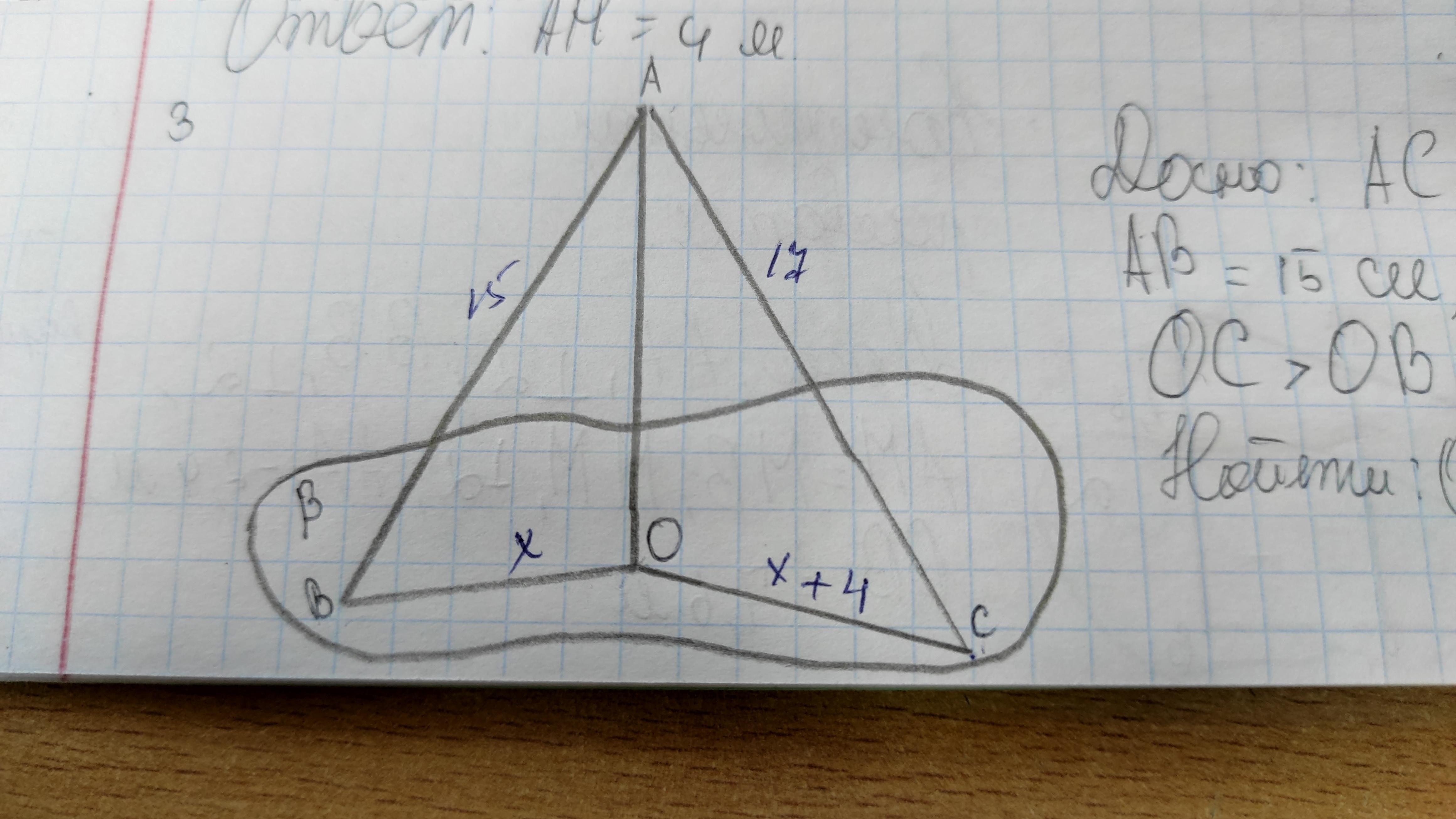 Ac = 17, ab = 15, ao перпендикулярна плоскости альфа, oc больше ob на 4. Найти oc, ob.