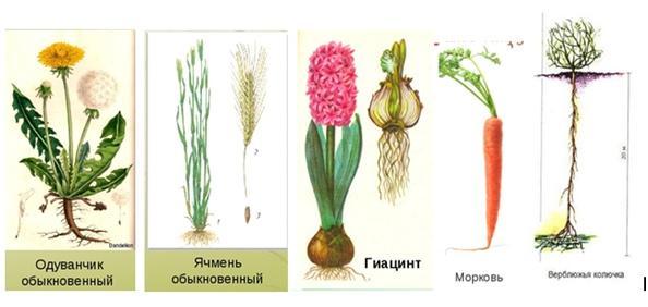Одуванчик-стержневая; Ячмень- мочковатая; Гиацинт - изменён в луковицу; Морковь- стержневая; Верблюжья колючка- вроде мочковатая, придаточные корни держат ее в земле, но в тоже время главный корень очень глубоко уходит, это тоже помогает держаться
