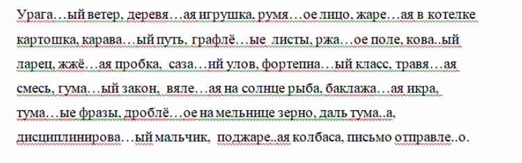 Ураганный ветер , деревянная игрушка, румяное лицо,жареная в котелке картошка, караванный путь, графленые листы , ржаное поле, кованый ларец, жжёная пробка , сазаний улов, фортепианный класс, травяная смесь, гуманный закон, вяленая на солнце рыба , баклажанная икра , туманные фразы, дробленное на мельнице зерно, даль тумана ,дисциплинированный мальчик, поджаренная колбаса, письмо отправлено