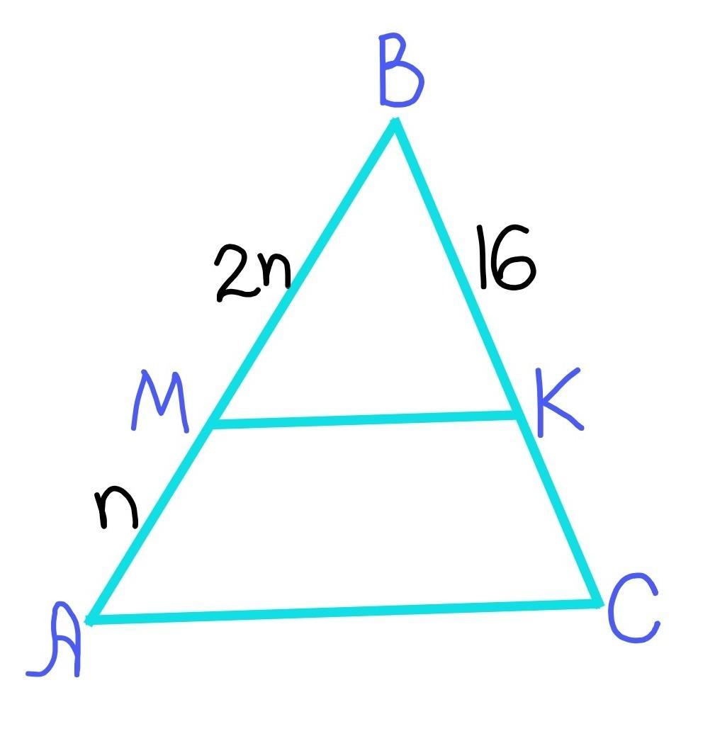 Решить задачу: дан треугольник АВС, МК ║ АС (М лежит на АВ, К лежит на ВС), ВК=16 см, отрезок ВМ в 2 раза больше отрезка АМ. Определите сторону ВС.