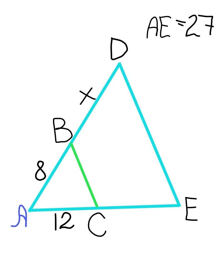 Решить задачу: дан треугольник АДЕ, ВС║ДЕ (В лежит на АД, С лежит на АЕ). Найдите ВД, если АВ=8, АС=12, АЕ=27.