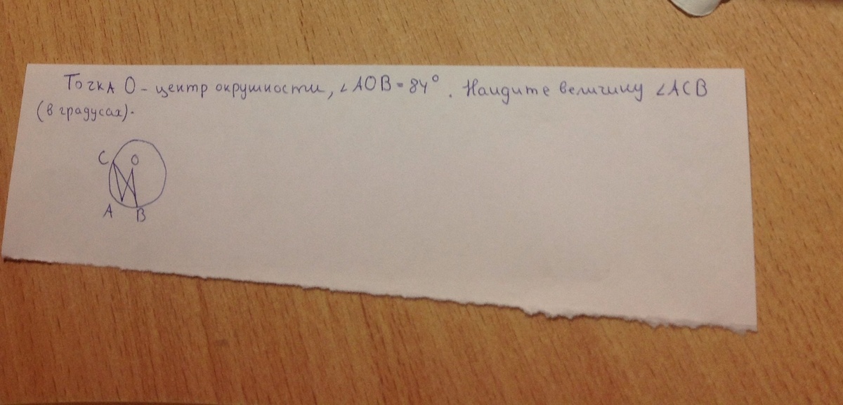 угол АСВ- вписанный= 1/2 дуги АВ ,на которую он опирается, а АОВ- центральный и измеряется дугой на которую он опирается дуга АВ =84, значит угол АСВ= 84:2=42
