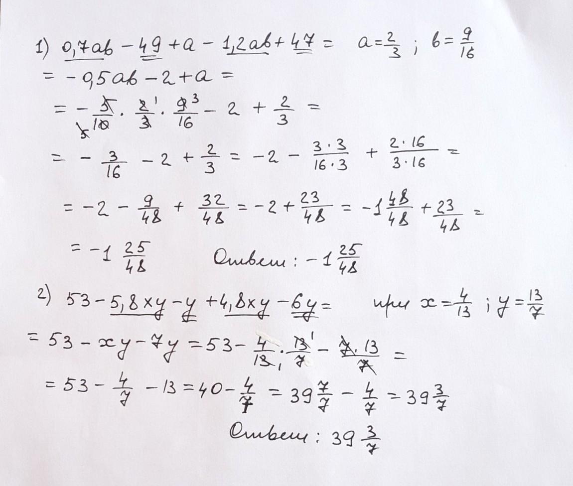 1) 0,7ab - 49 +а - 1,2ab+ 47 при а=2/3; b=9/16