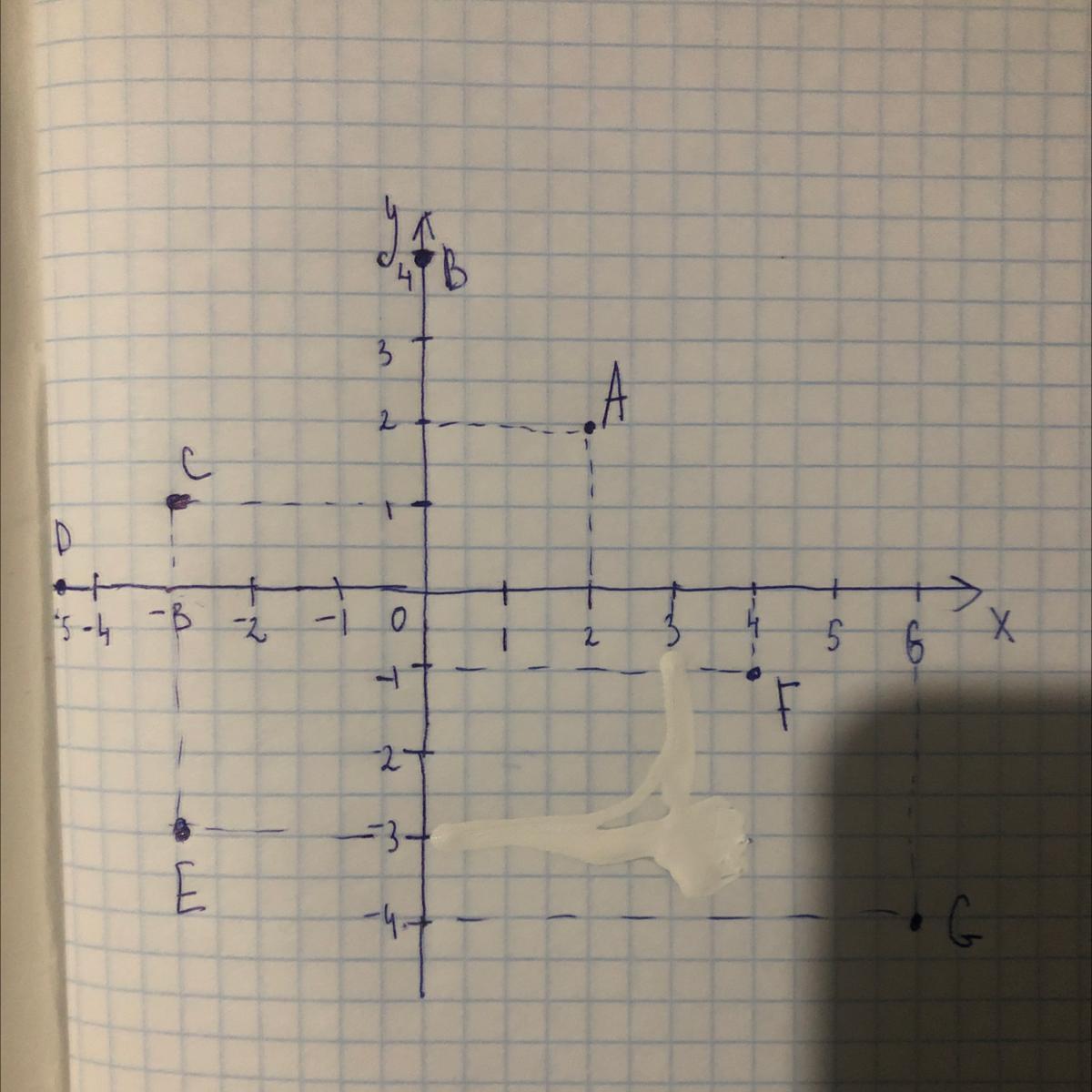Нарисуй координатную плоскость и отметь на ней точки: A(2;2); B(0;4); C(-3;1); D(-5;0); E(-3; -3); F(4; -1); G(6; -4).