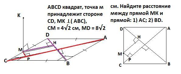 ABCD квадрат, точка м принадлежит стороне СD, MK ⊥( ABC), СМ = 4√2 см, MD = 8√2 см. Найдите расстояние между прямой МК и прямой: 1) АС; 2) BD.