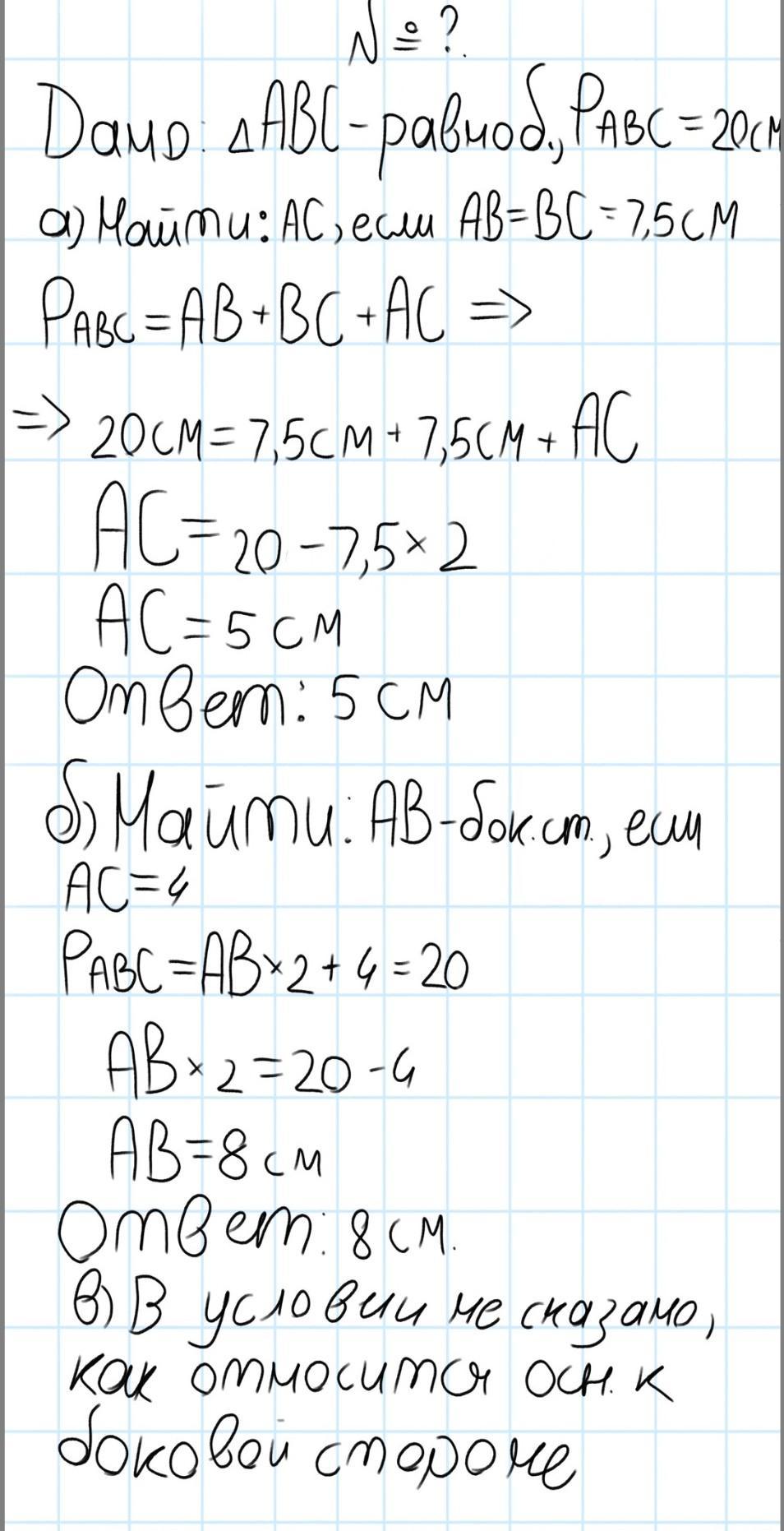 Треугольники, Признаки равенства треугольников 278. Периметр равнобедренного треугольника равен 20 см. Найдите. a) основание треугольника, если его боковая сторона равна 7,5 см; б) боковую сторону треугольника, если его основание равно 4 см B) стороны треугольника, если его боковая сторона относится к основанию