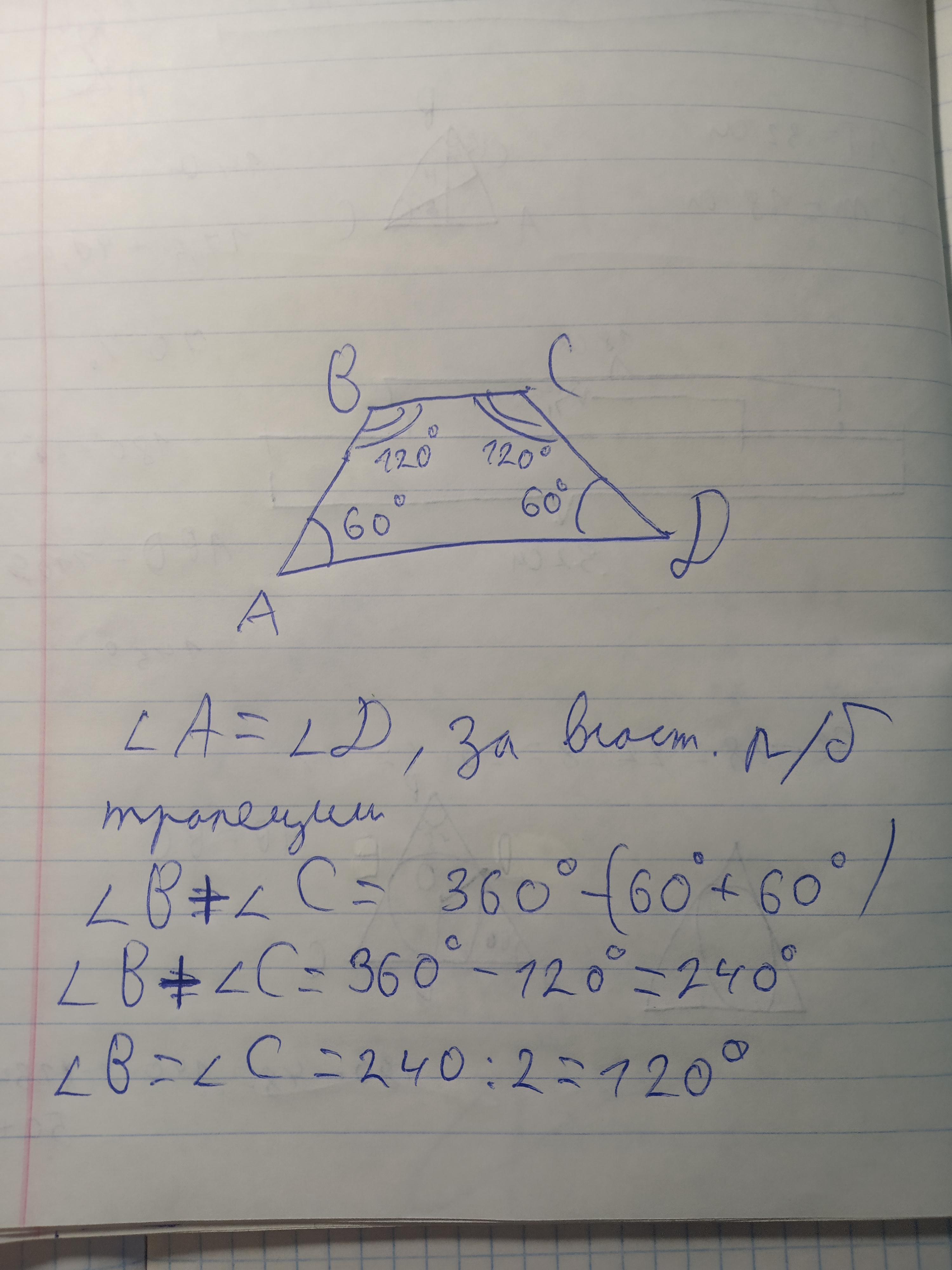 В ТРАПЕЦИИ АБЦД УГОЛ А РАВЕН 60 ГРАДУСАМ НАЙТИ КУТ Б КУТ Ц И КУТ Д