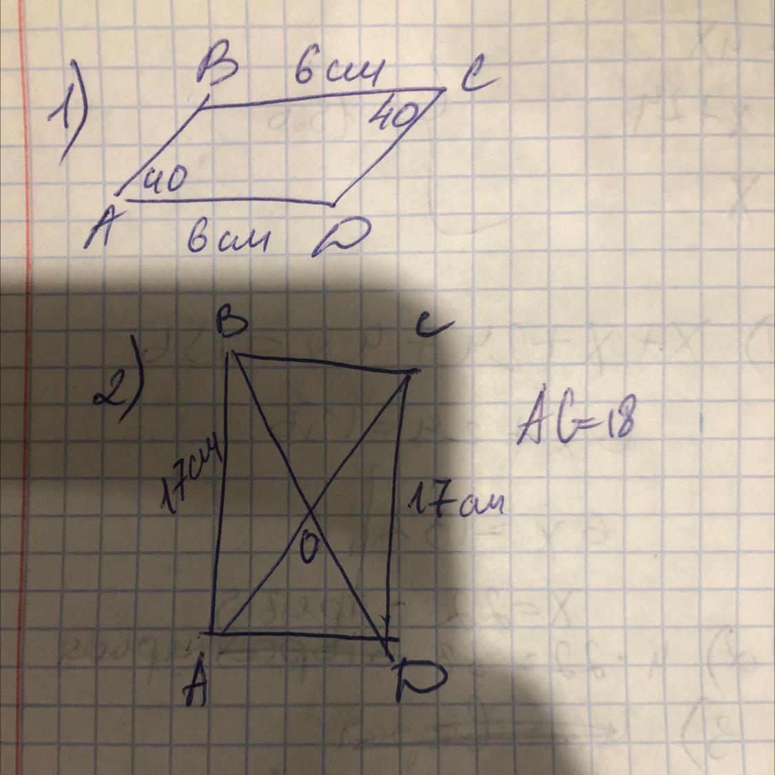 2.В прямоугольнике ABCD диагонали пересекаются в точке О. Сторона АС=18см, АВ=17см. Определите периметр треугольника COD.