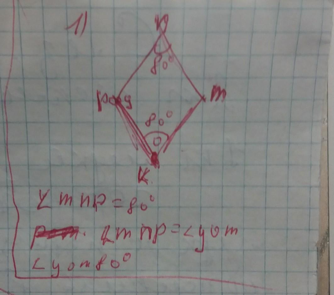 1.Диагонали ромба MNPK пересекаются в точке О. Найдите углы треугольника УОМ, если угол MNP=80°.