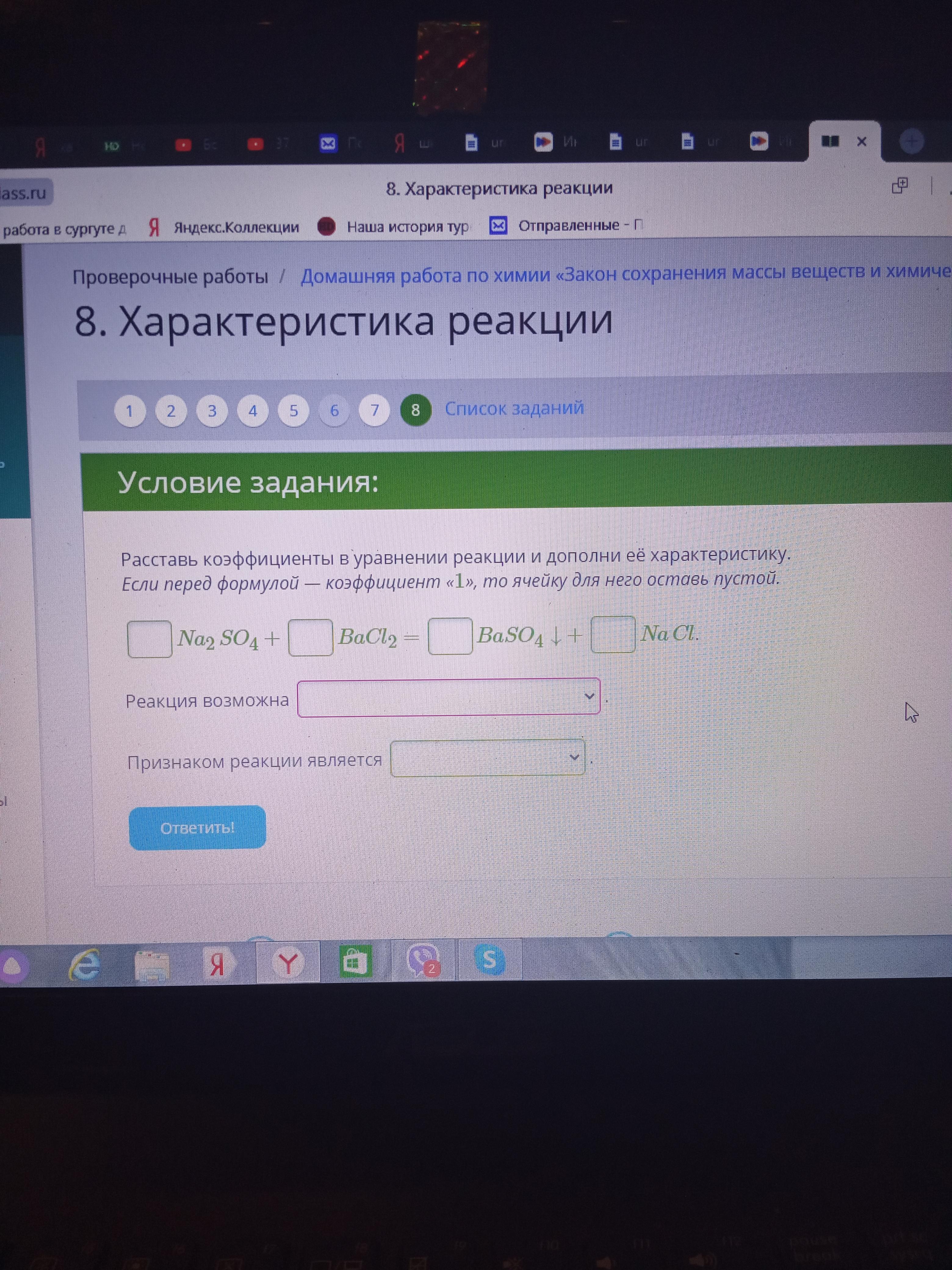 Расставь коэффициенты в уравнении реакции и дополни её характеристику. Если перед формулой-коэффициент "1", ту ячейку для него оставь в пустой.