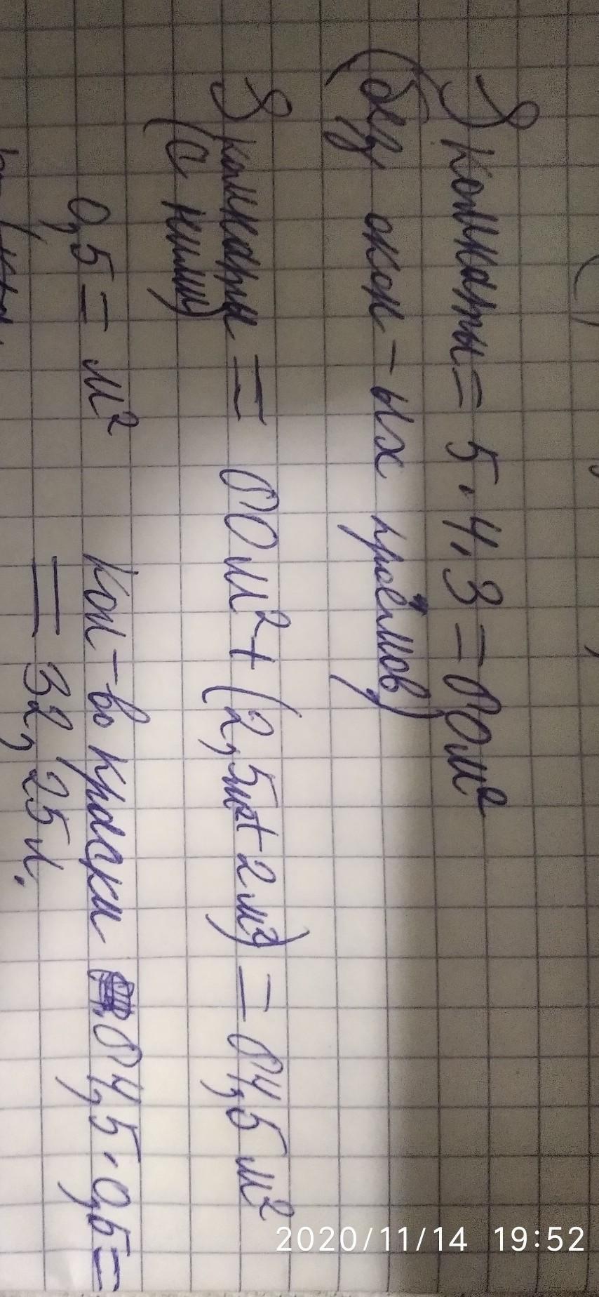 В прямоугольной комнате надо покрасить все стены краской, расход которой составляет лмx=0,5 л/м2. Сколько банок краски N надо купить, если длина комнаты мa=5 м, ширина — мb=4 м, высота — мc=3 м, а площади оконного и дверного проёмов — мS1=2,5 м2 и мS2=2 м2 соответственно. Объём краски в одной банке равен лV0=4 л. Стены покрываются одним слоем.