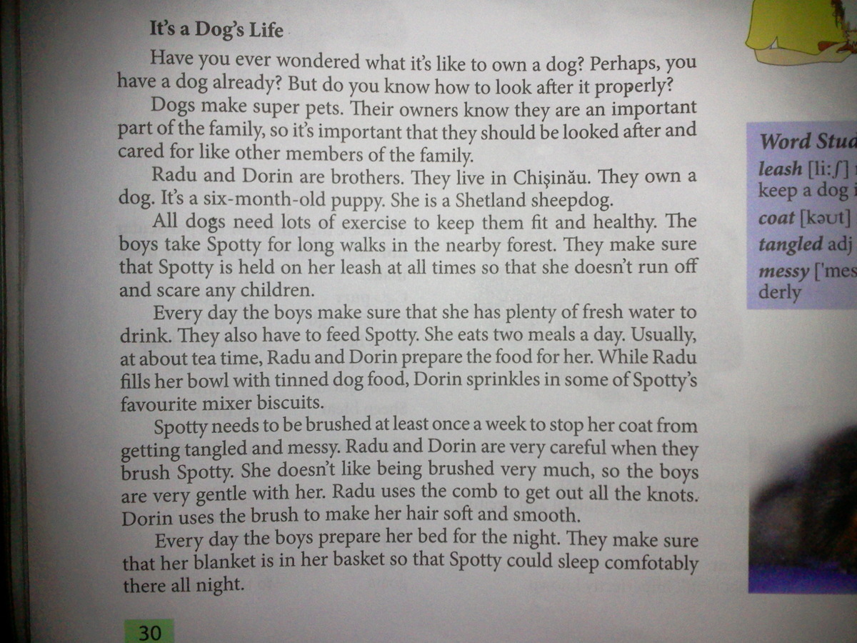 Раду и Дорин братья. Они живут в .... Они есть собака. Его шестимесячного щенка. Она является овчарка Шетландские. Все собаки нужно много упражнений, чтобы держать их в форме и здоровы. Ребята принимают пятнистый для долгих прогулок в соседнем лесу. Они уверены, что пятнистый проводится на ее поводке во все времена, так что она не убегает и напугать дети. Каждый день мальчики убедиться, что она имеет много пресной воды для питья. Они также должны кормить пятнистым. Она ест ХВО раза в день. Как правило, при температуре около время чая, Раду и Дорин готовить пищу для нее. Хотя Раду наполняет ее миску с консервами для собак Дорин брызгает в некоторых из любимых смесителя печенье пятнистым в.