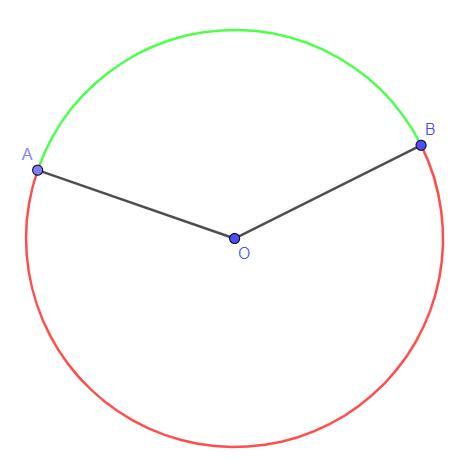 Дано: О - центр кола, ∪BA = ∪AB + 100° (∪BA - червона, ∪AB - зелена)