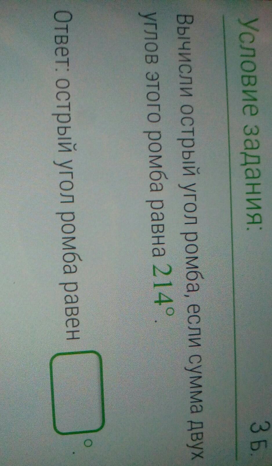 Тогда сумма острых углов равна: 360 – 214 = 146, тогда один угол равен 146/2 = 73