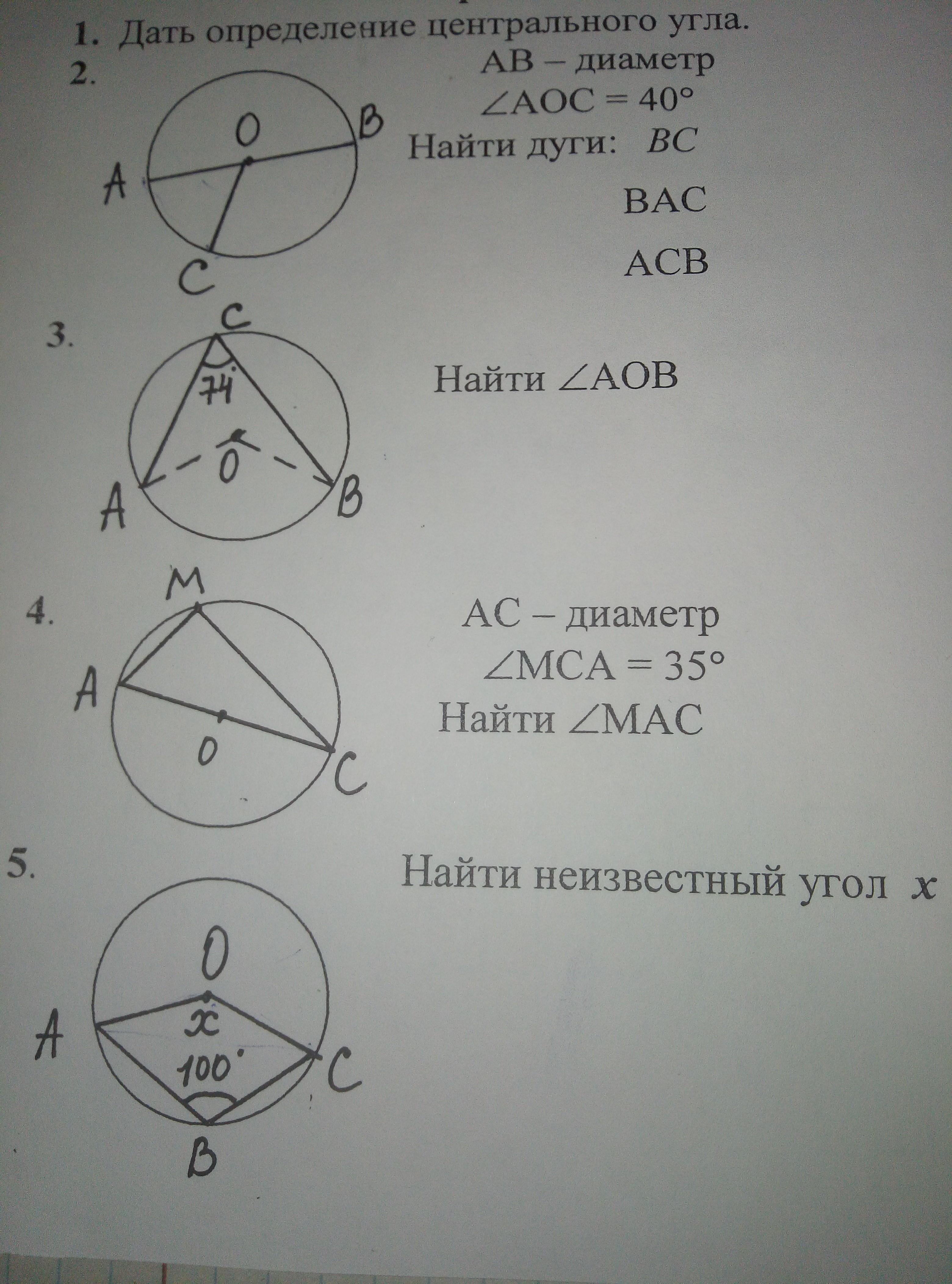 2. AB диаметр, значит, дуга АСВ 180°. угол АОС центральный значит дуга АС 40°