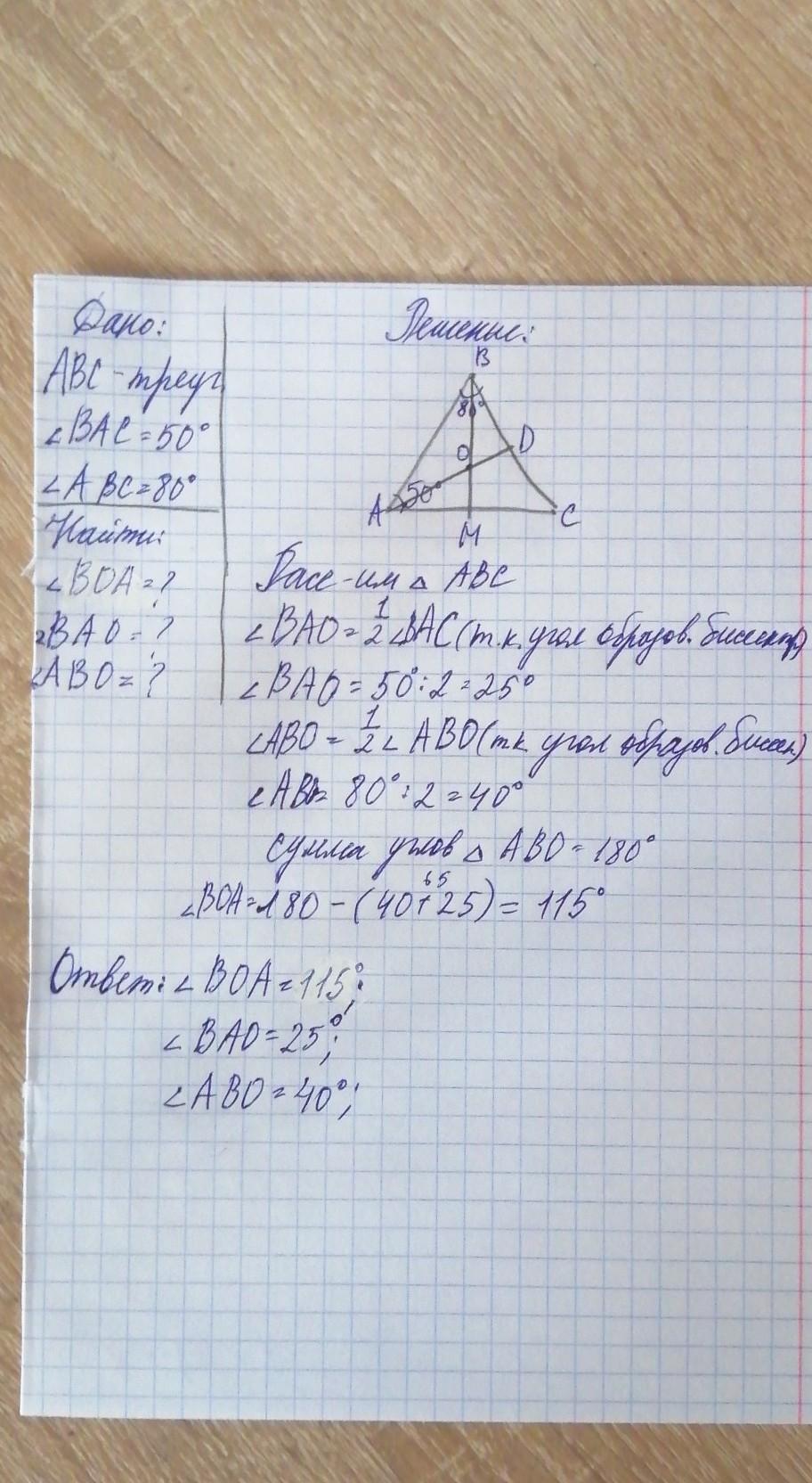 В треугольнике ABC проведены биссектрисы Ad и BM, которые пересекаются в точке О.Найдите углы треугольника ABO,если угол BaC=50 градусов,угол ABC/=80 градусов,а сумма углов треугольника равна ABO равна 180 градусов