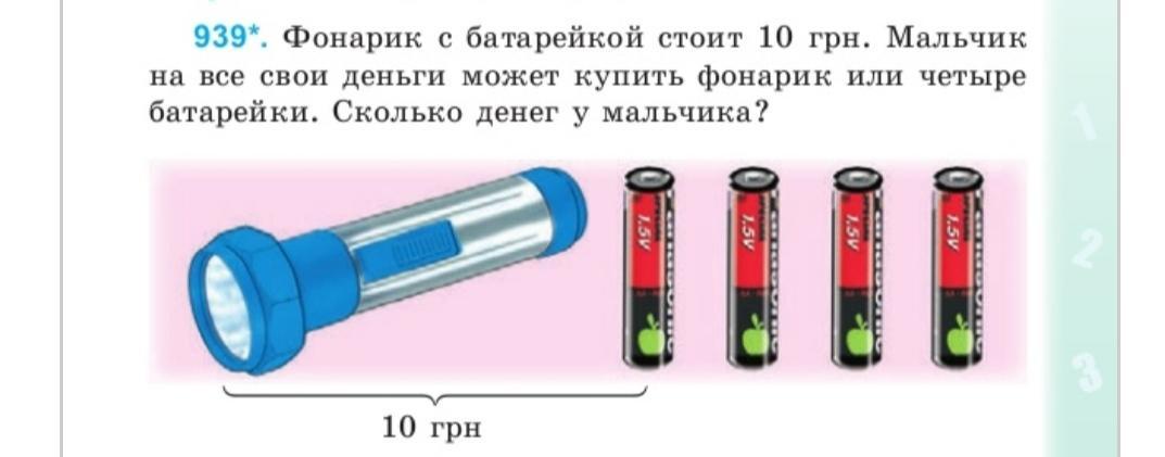 Так как один фонарик и одна батарейка дают в сумме 10 грн, то соответственно общая сумма денег у мальчика, не должна быть больше 10