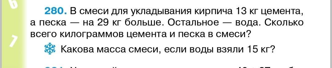13+29=42 песка. 13+42=55 песка и цемента.55+15=70 смесь