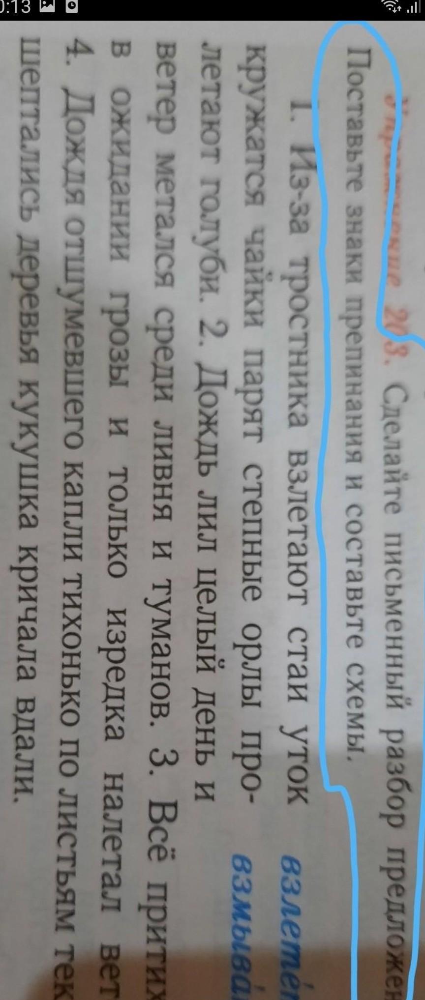 1.Из-за тростника взлетают стаи уток, кружатся чайки, парят степные орлы, пролетают голуби. 2. Дождь лил целый день, и ветер метался среди ливня и туманов. 3. Всё притихло в ожидании грозы, и только изредка налетал ветер. 4. Дождя отшумевшего капли тихонько по листьям текут, шептались деревья, кукушка кричала вдали.