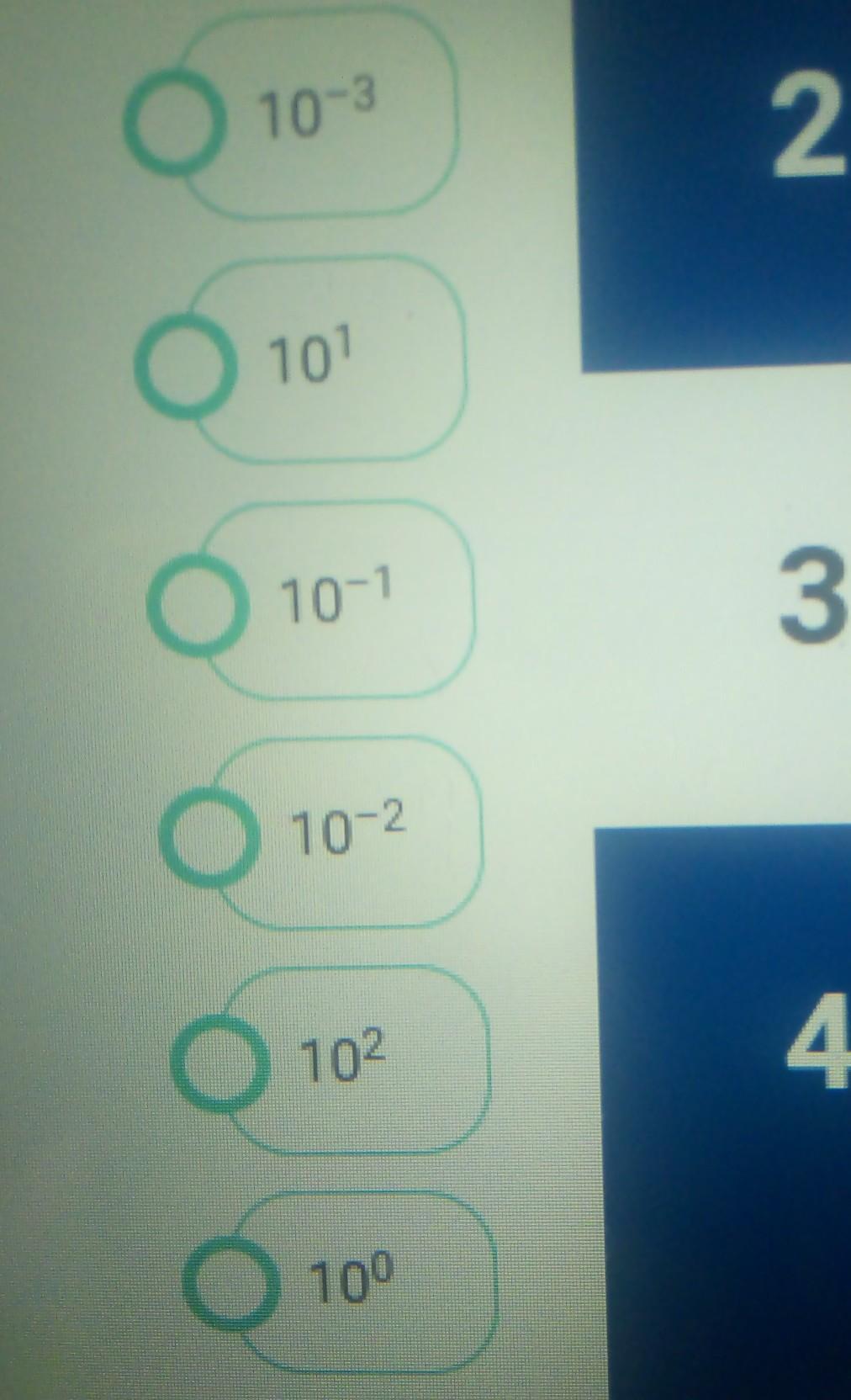 0.001 - 10^{-3}\\\\1 - 10^1\\\\0.1 - 10^{-1}\\\\0.01 - 10^{-2}\\\\100 - 10^2\\\\1-10^0