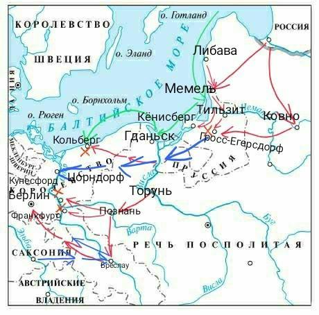 Отметь стрелками разных цветов действия русской и прусской армии, русского флота;