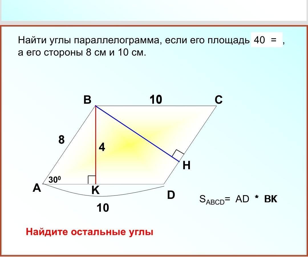 Ответ: угол А = угол С = 30° ; угол В = угол D = 150°