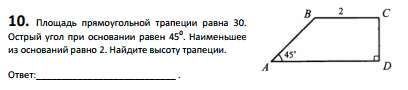 пусть высота =аS= 0.5(2+2+a)a=304a+a²-60=0a²+4a-60=0a=6 a=-10 Ответ 6