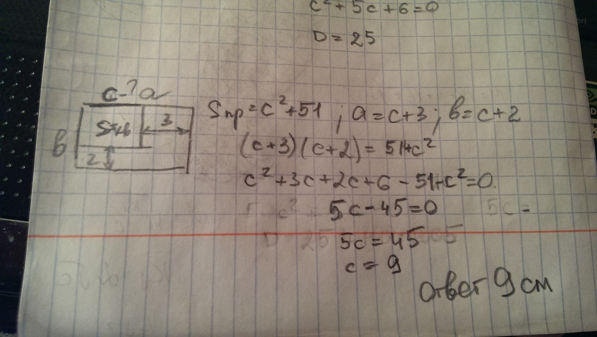 Из прямоугольного листа фанеры вырезали квадратную пластинку, для чего с одной стороны листа фанеры отрезали полосу шириной 2 см, а с другой, соседней, 3 см. Найди сторону получившегося квадрата, если известно, что его площадь на 51 см2 меньше площади прямоугольника.