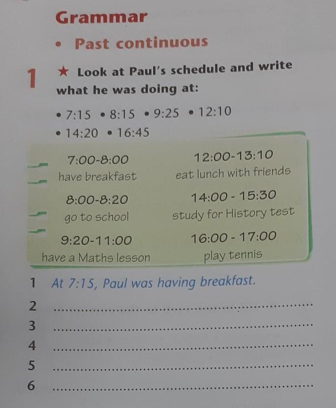 1) At 7:15, Paul was having breakfast (7:00 < 7:15 < 8:00) (почему он так долго ест? Он идет в школу меньше, чем завтракает...)