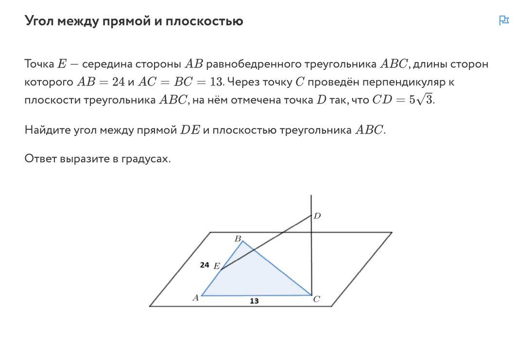 Найдите угол между прямой DE и плоскостью треугольника ABC .
