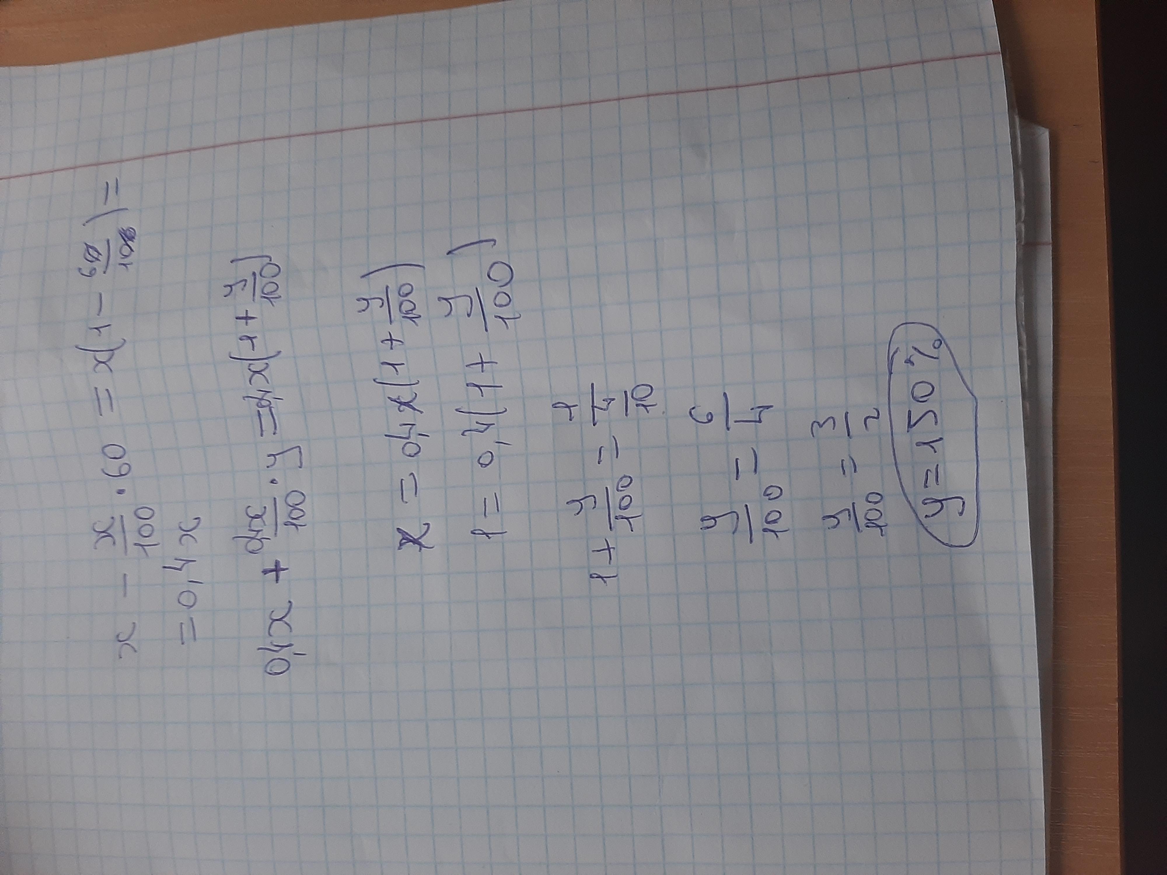 Цена на товар была снижена на 60%. На сколько процентов надо теперь её повысить, чтобы получить первоначальную цену
