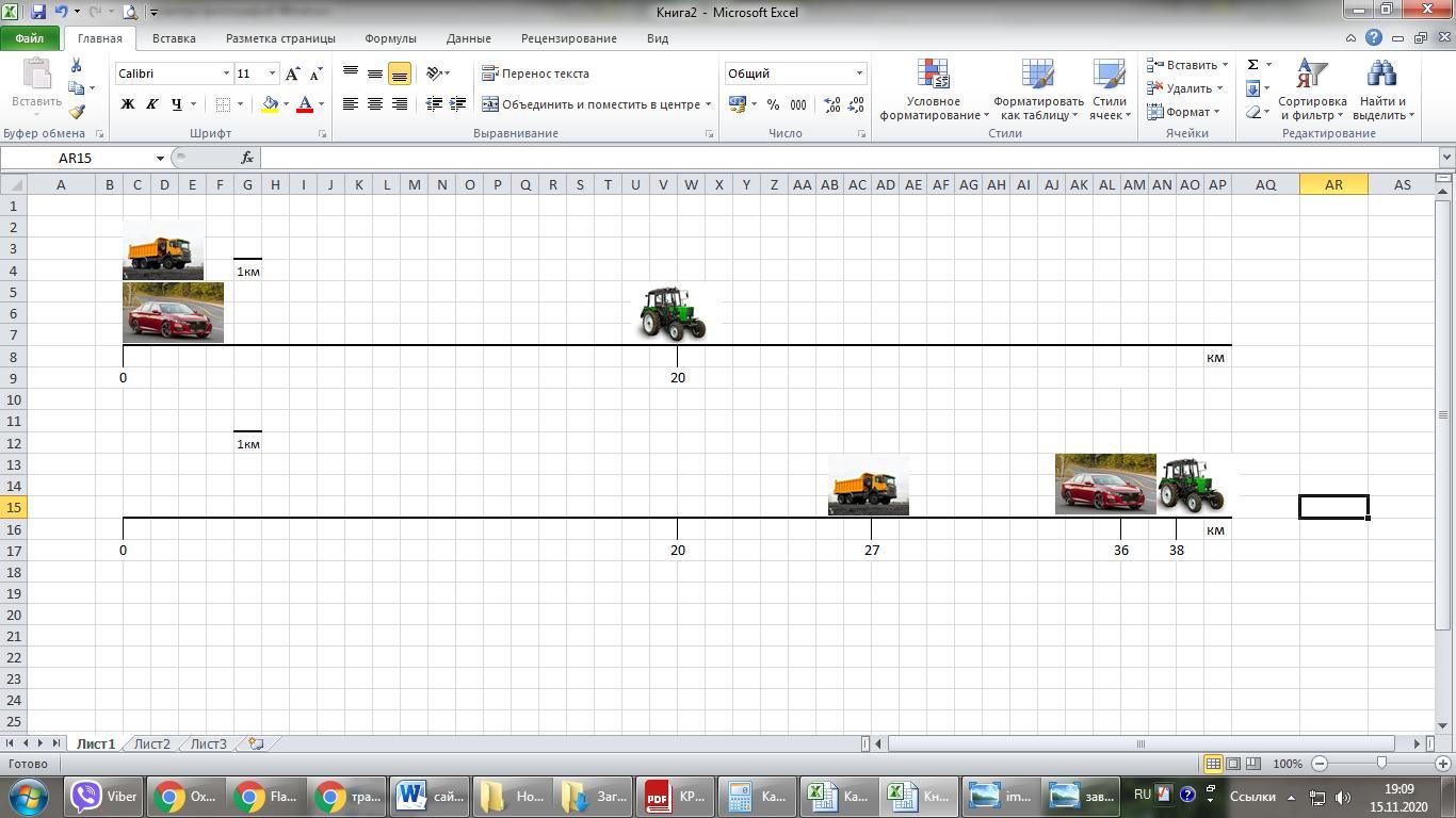 х₁ -х₃=38-36=2км. Це означає, що трактор знаходиться на 2км попереду легкового автомобіля.