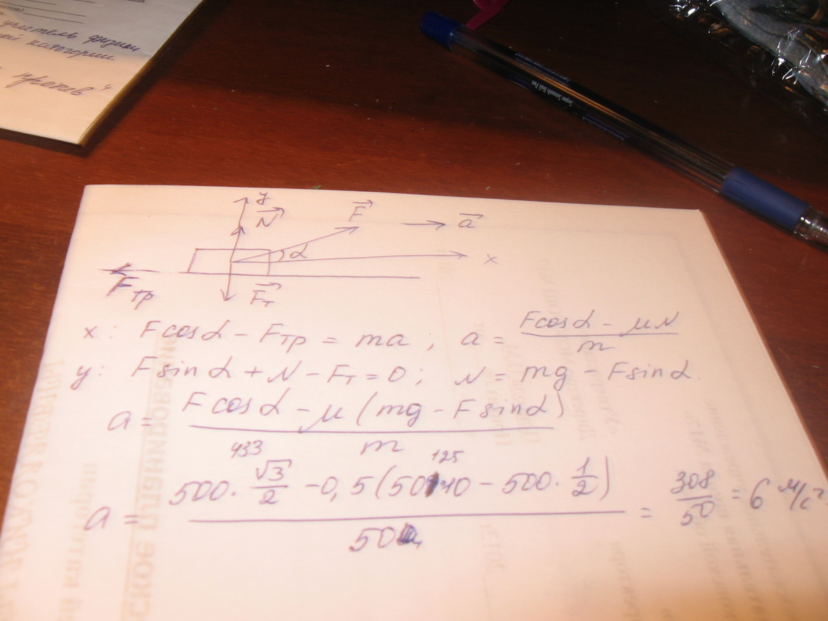 груз массой 50 кг перемещается по горизонтальной поверхности под действием силы 500 Н, направленной по углом 30 градусов к горизонту.коэффициент трения груза о плоскость равен 0.5.определите ускорение тела