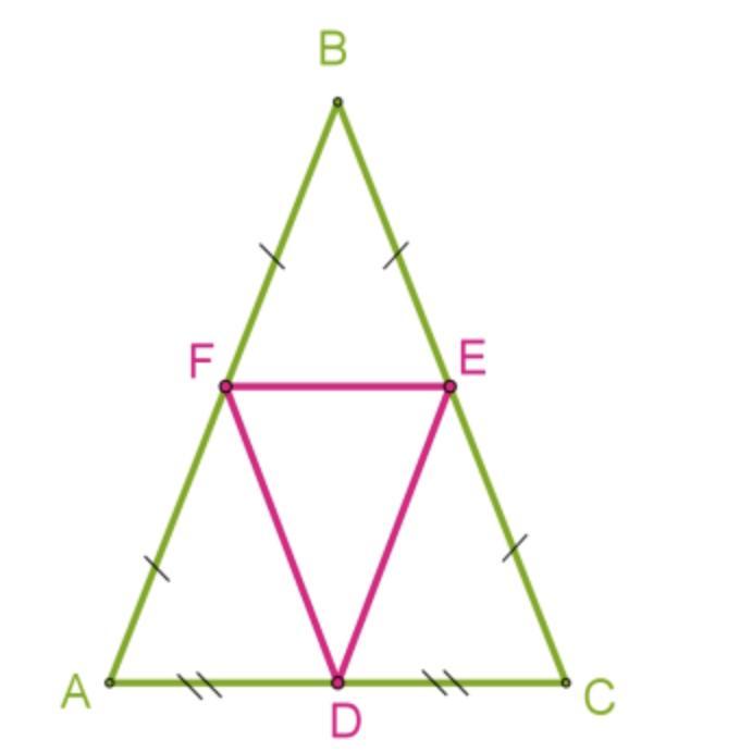 Задание: В равнобедренном треугольнике соединены серединные точки сторон. Докажи, что полученный треугольник тоже является равнобедренным.