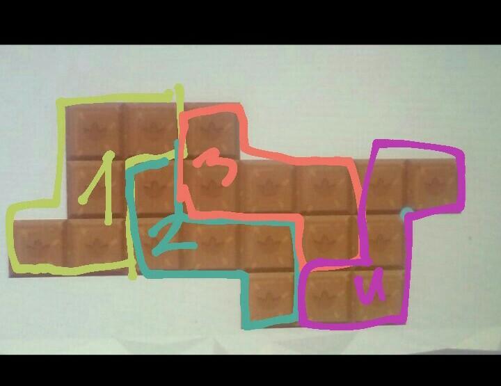 Надіюсь зрозуміло, в кожній частині по 5 клітинок шоколаду, і всі одинакові по формі