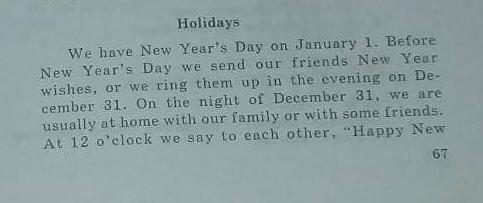 У нас Новый год 1 января. Перед Новым годом мы отправляем друзьям новогодние пожелания или звоним им вечером 31 декабря. Ночью 31 декабря мы обычно дома с семьей. или с друзьями. В 12 часов мы говорим друг другу. "Счастливого Нового