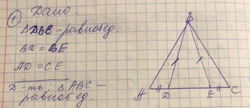 2) Посколько треуг. ADB и CBE - одинаковые, и треуг. DBE - равнобедренный, тогда треуг. ABC - равнобедренный.