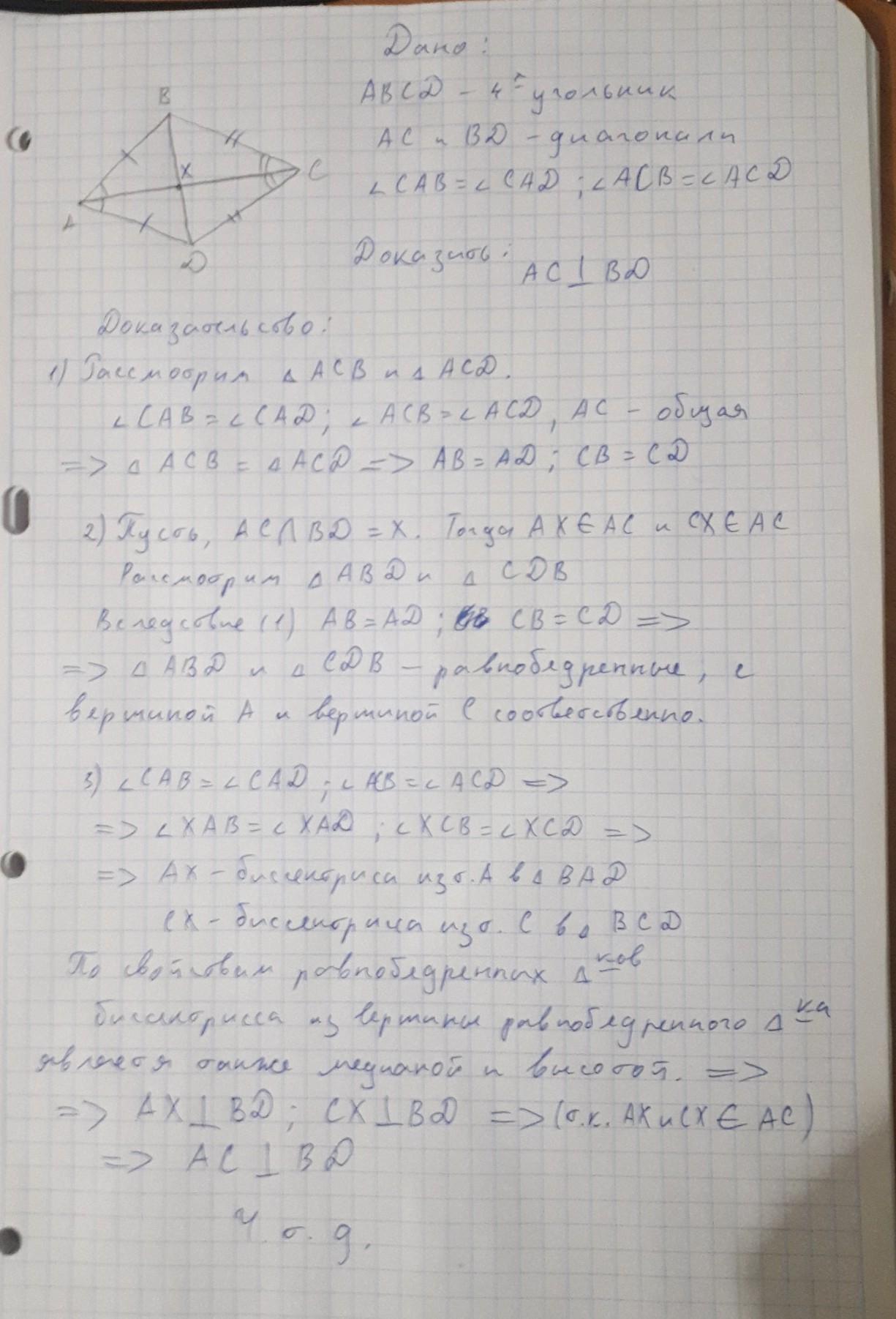 В четырех угольнике ABCD диагональ AC делит углы BAD и BCD пополам . Докажите , что её диагонали перпендикулярны