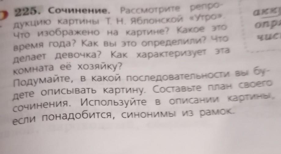 На картине изображена комната, только проснувшаяся девушка, завтрак на столе с синей скатертью и прекрасная погода. На улице лето, зеленые листья и открытое настежь окно, говорят о том, что комната заполнена удушьем солнца, девушка неспеша разминает свое хрупкое тело. В школу никто не пойдет, опять же повторюсь, лето. По неаккуратности комнаты, можно понять, девушка энергичная и жизнерадостная, достаточно не сдержанна для долгих посиделок.