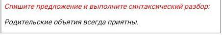 Родительские(подчеркни волнистой линией,сверху пиши: прил. мн.ч. Им.п) объятия(одной линией,сверху: сущ. ед.р) всегда(пунктиром(_ _ _ _)сверху: нар.) приятны(двумя линиями(т.к сказуемое))сверху:краткое.прил., мн.ч)