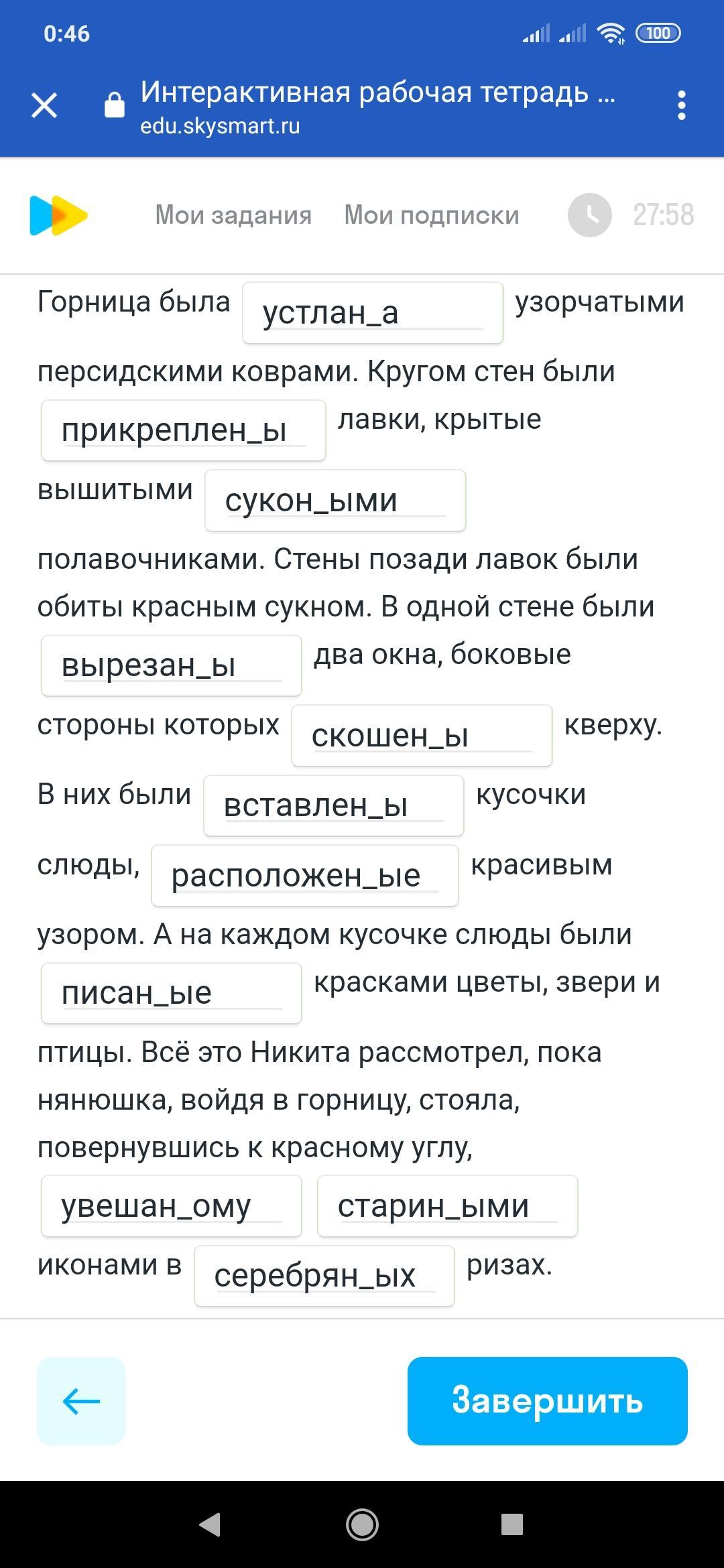 Горница была устлана узорчатами персидскими коврами. Кругом стен были прикреплены лавки, крытые вышитыми суконными полавочниками. Стены позади лавок были обиты красным сукном. В одной стене были вырезаны два окна, боковые стороны которых скошены кверху. В них были вставлены кусочки слюды, расположенные красивым узором. А на каждом кусочке слюды были писанные красками цветы, звери и птицы. Всё жто Никита рассмотрел, пока нянюшка, войдя в горницу, стояла, повернувшись к красному углу увешанному старинными иконами в серебряных ризах.