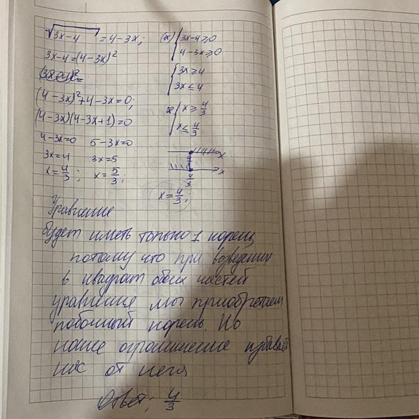 Сколько корней имеет уравнение √3x-4 = 4-3x?