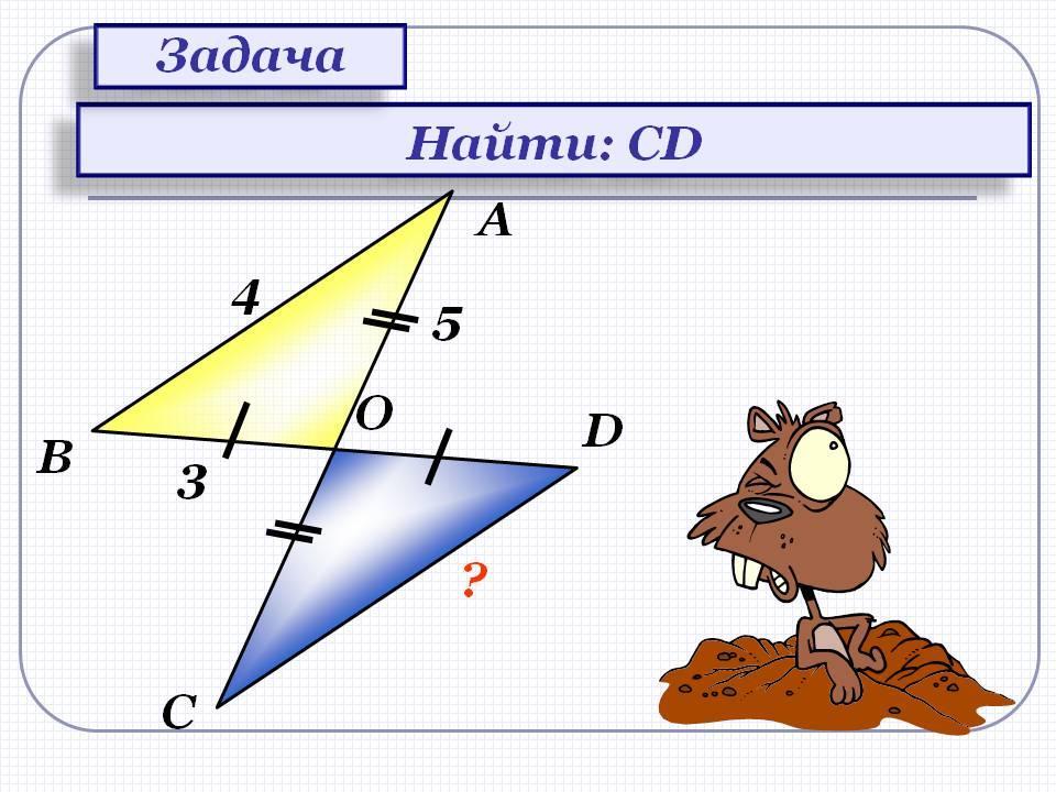 На рисунке 3 и 5 надо убрать. Треугольники равны по 1 признаку. По двум равным сторонам и углу между ними (вертикальные). СД=ВА=4.