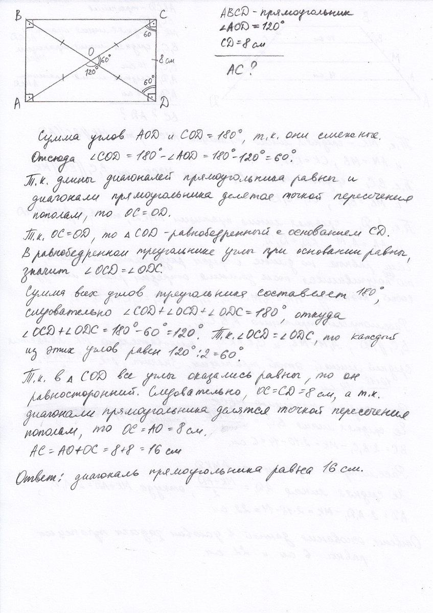в прямоугольнике один из углов, образованный диагоналями, равен 120 градусам. Меньшая сторона прямоугольника равна 8 см, тогда диагональ прямоугольника равна-?