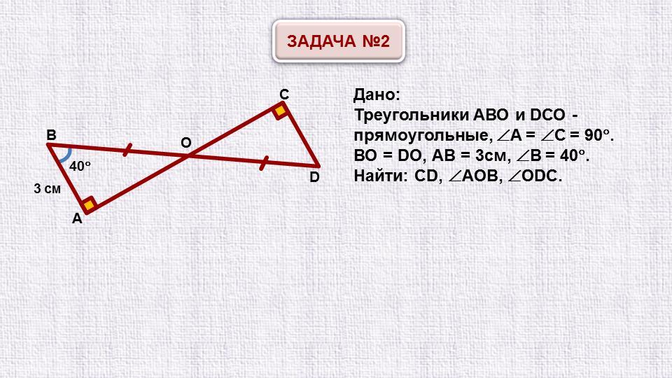 значит, ΔАОВ = ΔCOD по стороне и двум прилежащим к ней углам.