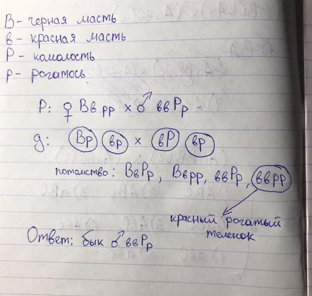 У крупного рогатого скота черная масть (В) – доминантный признак, красная – рецессивный. Комолость – доминантный признак (Р), рогатость – рецессивный. Спарили черных рогатых коров с красным комолым быком. Среди потомков был один красный рогатый теленок. Укажите генотип быка
