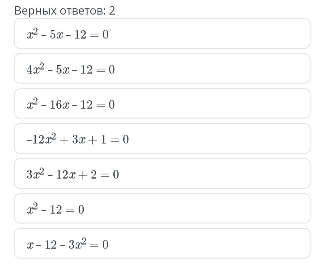 Выбери уравнения, соответствующие описанию: «приведенное полное квадратное уравнение, свободный член равен –12».