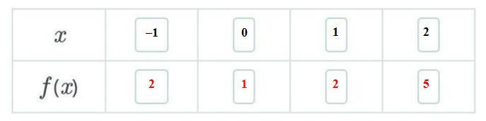 Функция задана формулой f (x) = x2 + 1, где –1 ≤ x ≤ 2. Составь таблицу с шагом 1 и заполни ее, вычислив соответствующее значение функции.
